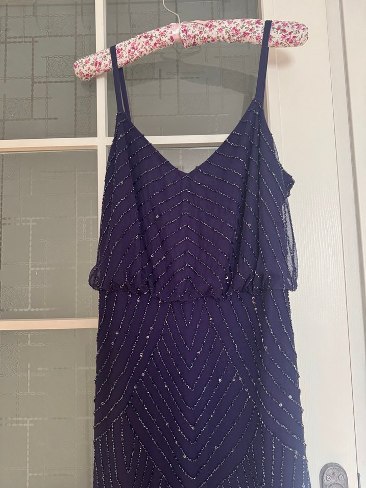 Adil Işık marka Mor renkli, V yaka, ince askılı, işlemeli ve drapeli detaylara sahip, vücuda oturan uzun boy gece elbisesi, şık parti davetleri için uygun. M beden, bir kaç kez giyildi, yer yer boncuklarında dökülmeler var #abiye#geceelbisesi
