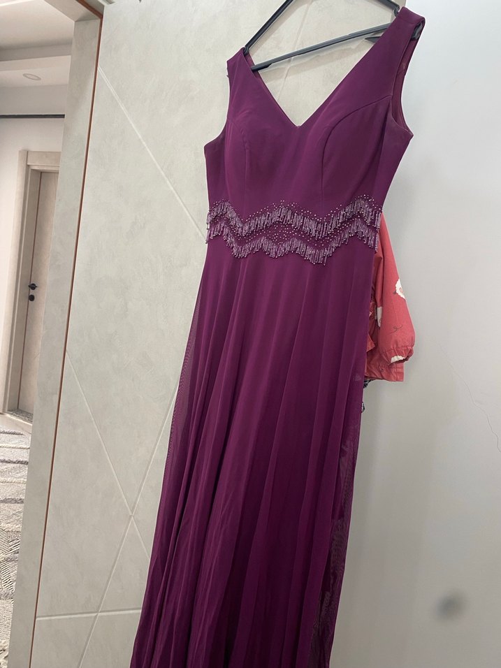 Mor renkli, V yakalı ve kolsuz, işlemeli detaylara sahip, drapeli, klasik modern tarzda uzun ve fitted abiye elbise. 1 kez giyildi