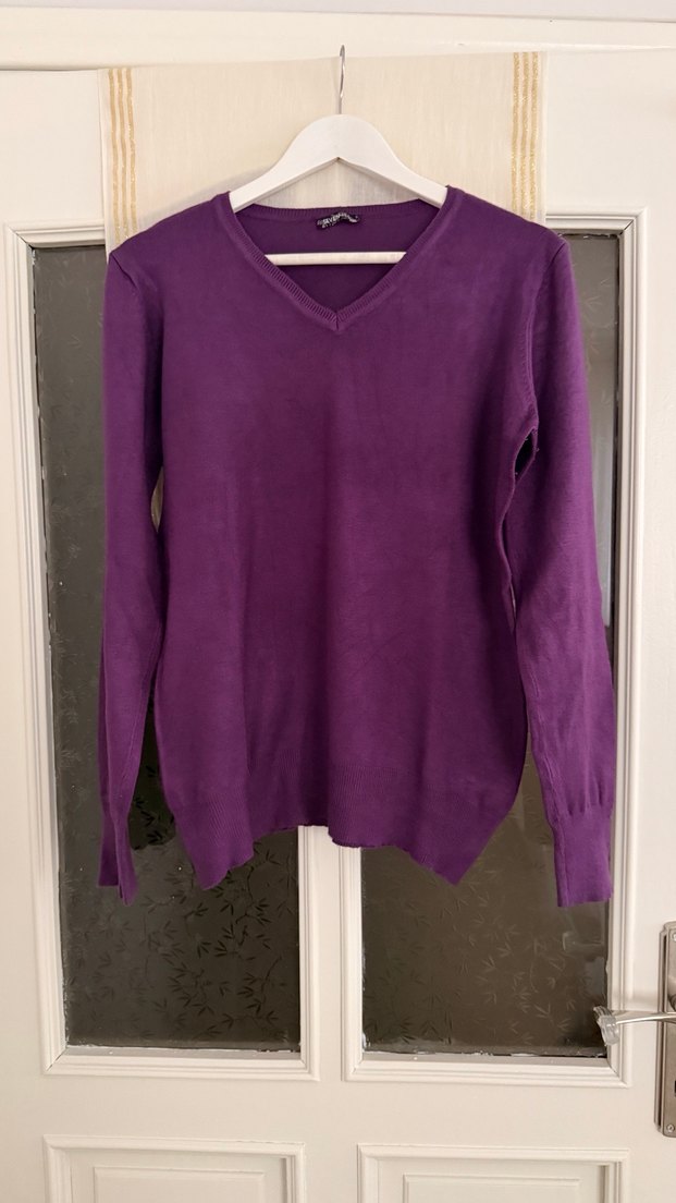 V yaka, uzun kollu mor renk kadın kazak. Günlük kullanıma uygundur. En 52 cm Boy 64 cm