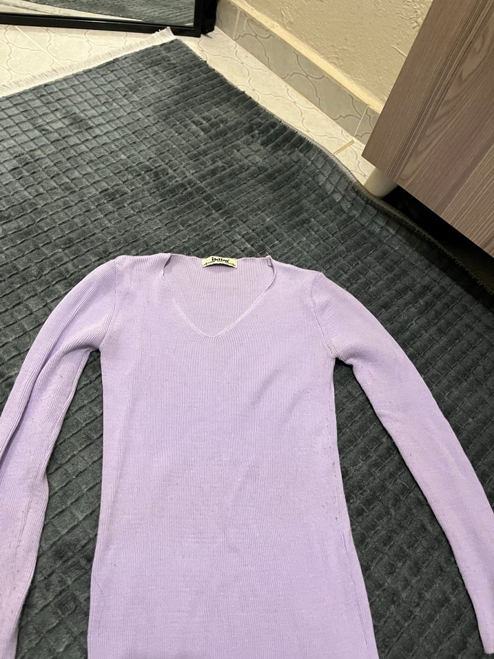 Mor pastel renkte, V yaka ve uzun kollu, vücuda oturan kadın triko kazak. Desensiz, rahat ve şık tasarımıyla günlük kullanıma uygundur.