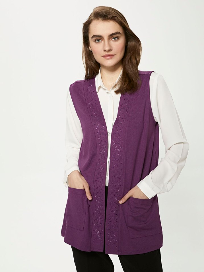 Mor renkli, V yaka ve kolsuz yelek. Rahat ve bol kesim, normal uzunlukta, ön cepli, günlük kullanıma uygun. Hiç giyilmedi.