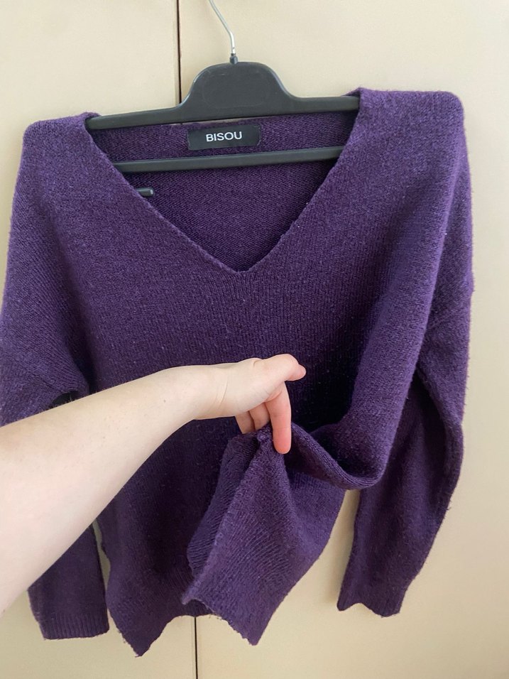 Mor renkli, V yaka ve uzun kollu, yün örgü kazak. Bol kesim ve normal uzunlukta, desen içermeyen rahat bir model. Üzerinde "BISOU" etiketi bulunur.