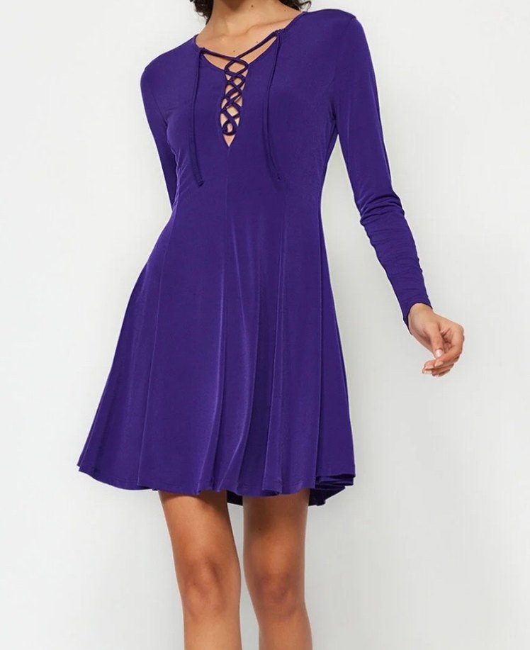 Mor V Yaka bağlama detaylı kısa Elbise iade yoktur