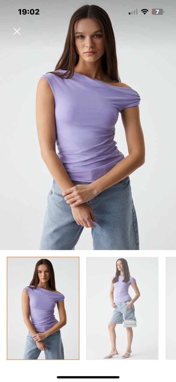 Mor renkte, V yaka ve kısa kollu, oturan kesime sahip kadın bluz. Denim kumaştan, midi boyda, rahat ve şık bir tarz sunar.