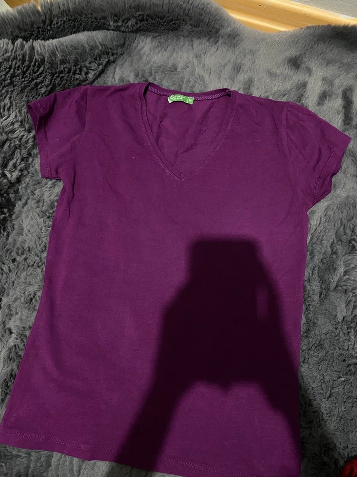 Mor renk, V yaka ve kısa kollu, dar kesim kadın tişörtü. Günlük kullanıma uygun, rahat ve şık sokak stili. Yanlış beden aldığım için satıyorum