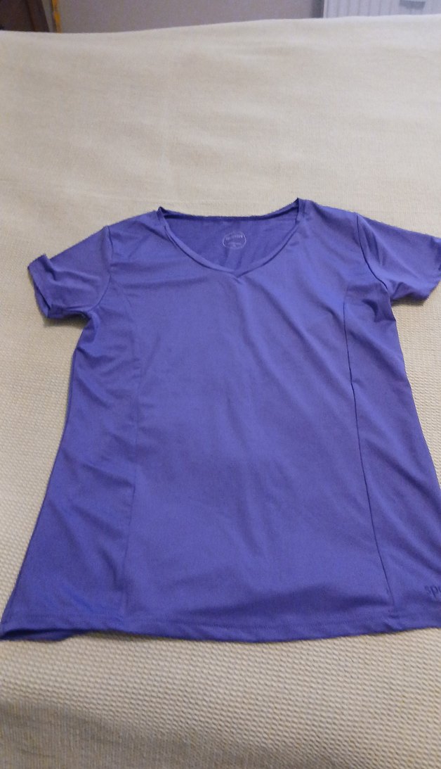 Mor renkte, V yakalı ve kısa kollu kadın tişörtü. Sentetik kumaştan, bol kesim ve normal uzunlukta, günlük kullanıma ve spora uygun rahat bir model.
