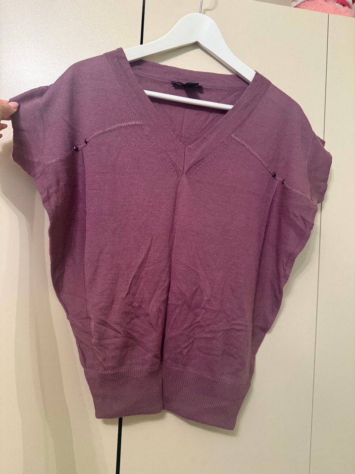 Mor V Yaka Kısa Kollu Salaş Kadın Kazak