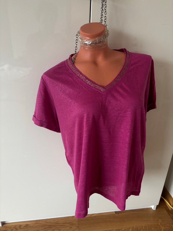 Devernois Mağazasından alındı hiç kullanılmadı. Orijinal bedeni 5 yani 48. Malzemesi 100% keten, parlak dokulu ve yumuşak bir kumaş . Göğüs 120 uzunluk 60 kol 19 iki omuz 43 cm. Plastik manken 34 beden ve ölçüleri 82-58-82 cm Mor V yaka, kısa kollu salaş tişört, satenimsi dokuda ve parlak görünümde. Dökümlü kesim ve baskılı deseniyle günlük kullanıma uygundur.