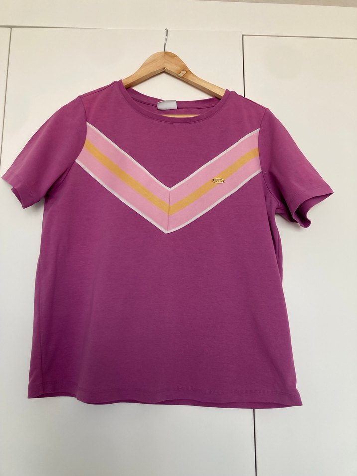 Mor renkli, kısa kollu, V yaka ve salaş kesim tişörtü, göğüste pastel renkli baskılı V deseni ile günlük sokak stili için uygun, ipeksi dokuda.