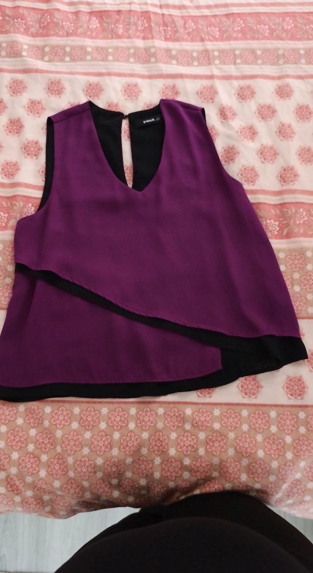 Kolsuz, V yakalı ve drapeli tasarıma sahip mor bluz. Gevşek kesim ve mini boyda, ipeksi kumaştan, minimalist goth tarzına uygun. Etek üstü kullanıma da sahip.