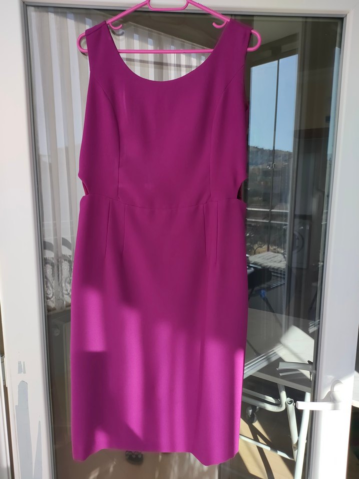 Mor renkte, V yakalı ve kolsuz midi elbise, drapeli ve rahat kesimiyle şık bir görünüm sunar.