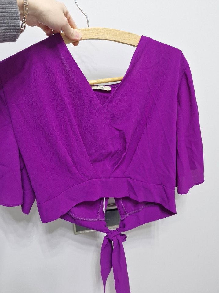 Mor renkli, V yakalı ve kuşaklı kadın bluzudur. İpek gibi dokusu, salaş kesimi vekollarıyla günlük kullanıma uygundur.✨ Arkadan çapraz olarak gelen bağlamasi vardir.Biraz crop modeldir