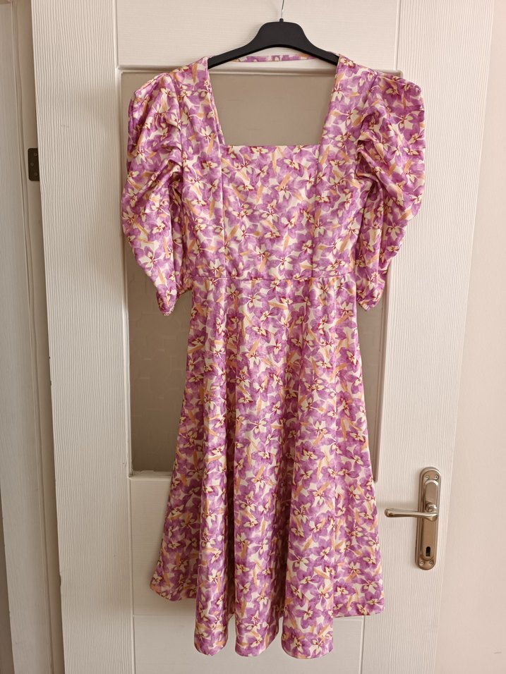 Mor pastel tie-dye desenli, V yakalı, kısa kollu ve bol kesimli midi bohem elbise.