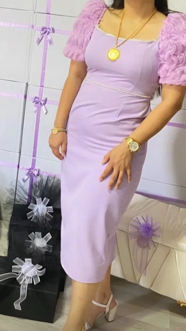 Mor, V yaka ve kısa kabarık kollu, midi boy, vücuda oturan elbise. Pastel tonlarda, rahat ve şık, düğün ve günlük kullanım için uygun.