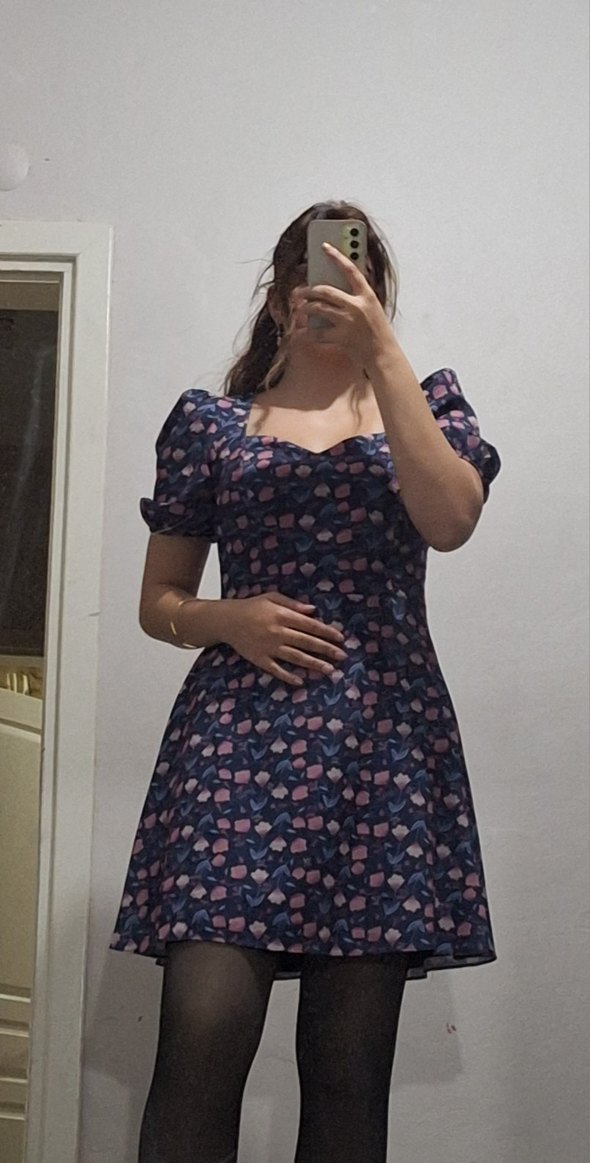 Mor tonlarında bağlama desenli, V yakalı ve kısa balon kollu midi boy oturan elbise. Düğmeli detaylarıyla bohem ve retro tarzını yansıtır. Romantik akşamlar için uygundur.