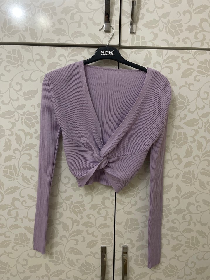 Mor renkli, uzun kollu ve V yakalı örgü kazak, önünde düğüm detayı vardır. Kısa kesimiyle rahat ve şık bir görünüm sunar.