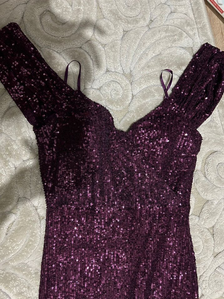V yaka ve ince askılı, mor renkli, parlak işlemeli uzun abiye elbise. Gösterişli ve fit kesimiyle gece partileri için uygun. ✨