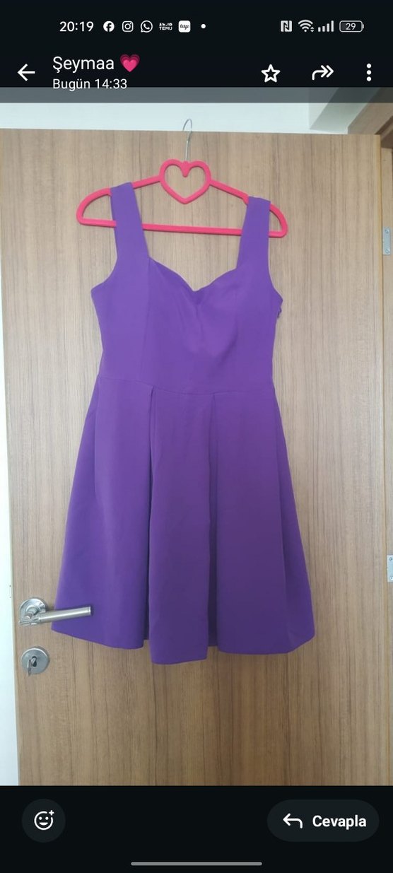 Mor, kolsuz, V yakalı, piliseli detaylı ve beli oturan midi elbise. Parlak ve minimalist bohem tarzıyla parti için uygun.