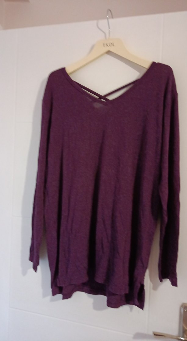 Mor keten kumaştan, V yaka ve çapraz detaylı, uzun kollu, rahat kesim kadın kazak. Midi uzunlukta, günlük kullanıma uygun, konforlu ve şık bir parça.