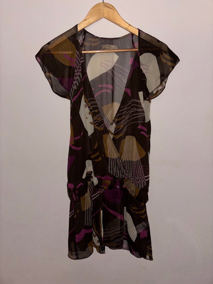 Mor renkli, V yaka ve kolsuz, salaş kesim bikini üstü. Uzun boylu, koyu tie-dye desenli ve sentetik yumuşak kumaştan, günlük kullanıma uygun bohem tarzda.
