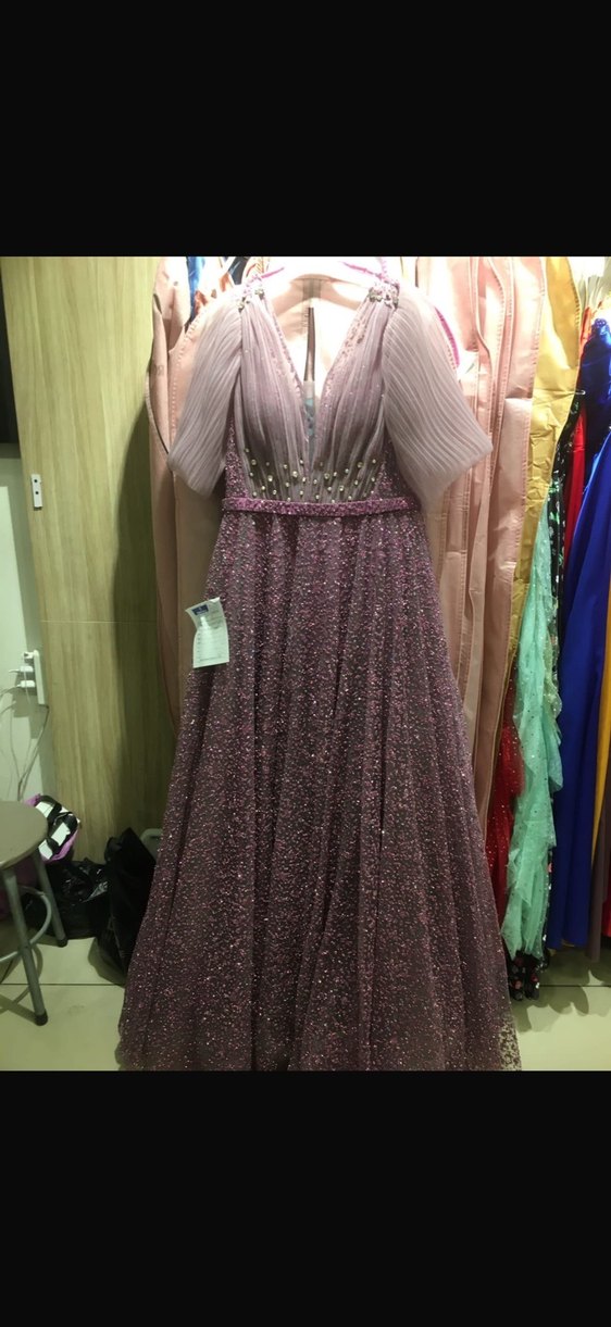 Mor renkli, V yaka, drapeli ve kolsuz uzun abiye elbise. Bol kesimli, düğünler için uygun, ışıltılı ve bohem tarzda.