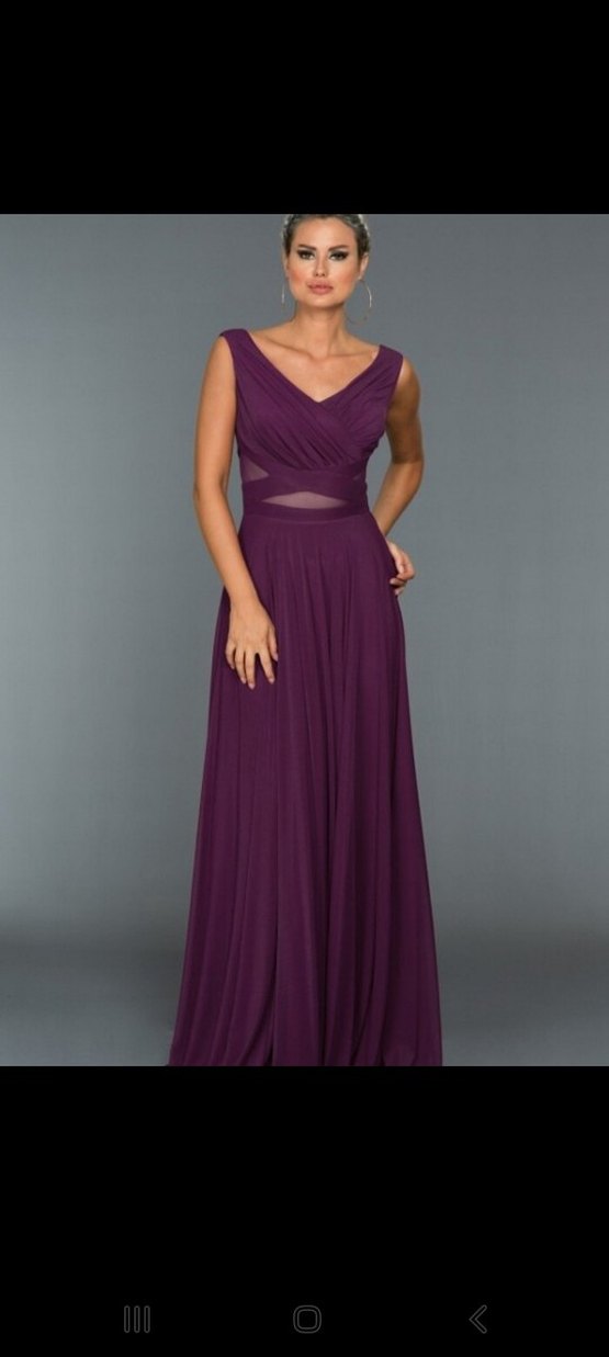 Mor renkte, V yakalı ve kolsuz uzun abiye elbise. Drapeli detayları ve transparan bel paneliyle şık bir görünüm sunar.