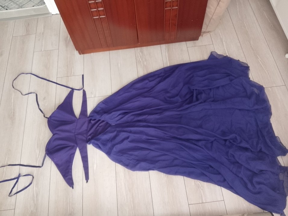 Bu koyu mor, v yaka ve ince askılı, drapeli uzun kadın abiye elbisesi düğünler için uygundur. Bohem tarzda, avangart dokunuşlar içerir. çok rahat ve şık bir elbise uzun süredir giyilmedigi için ütüye ihtiyacı var sadece bir kez ablamın kına gecesinde giyildi