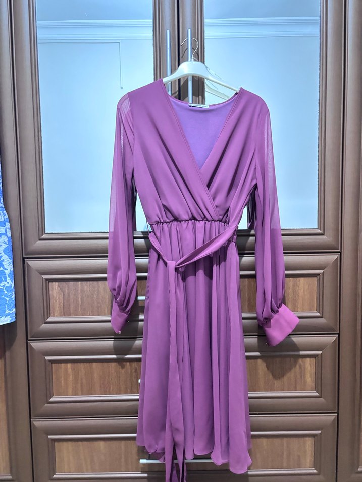 Bu mor uzun elbise, V yaka ve drapeli tasarımıyla, uzun kollu ve bol kesimdir. Yumuşak sentetik kumaştan yapılmıştır. Klasik şıklık için uygundur.