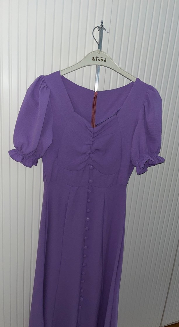 Mor renkte, V yakalı ve düğmeli uzun elbise. Kısa balon kollu, bol kesim ve yumuşak sentetik kumaştan üretilmiştir. Minimalist bohem tarzını yansıtır.