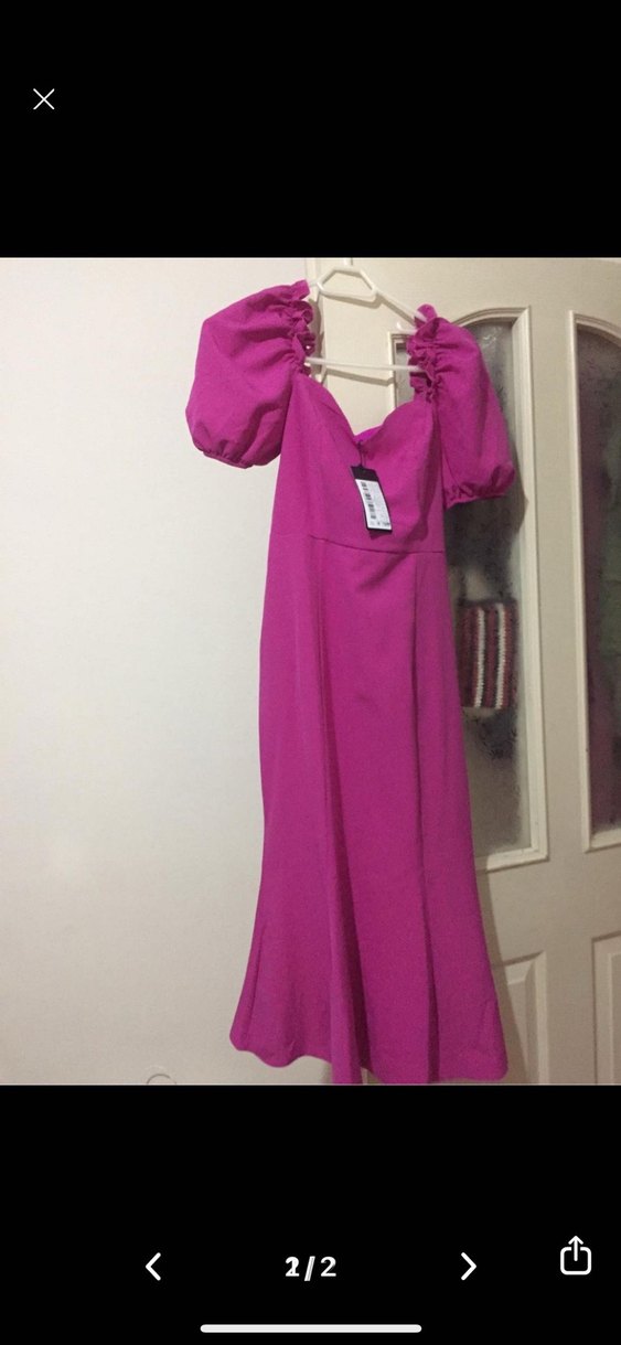 Mor renkli uzun elbise, V yakalı ve oturan kesimdir. Drapeli detaylara ve askılı kollara sahiptir. Düğün için uygundur.