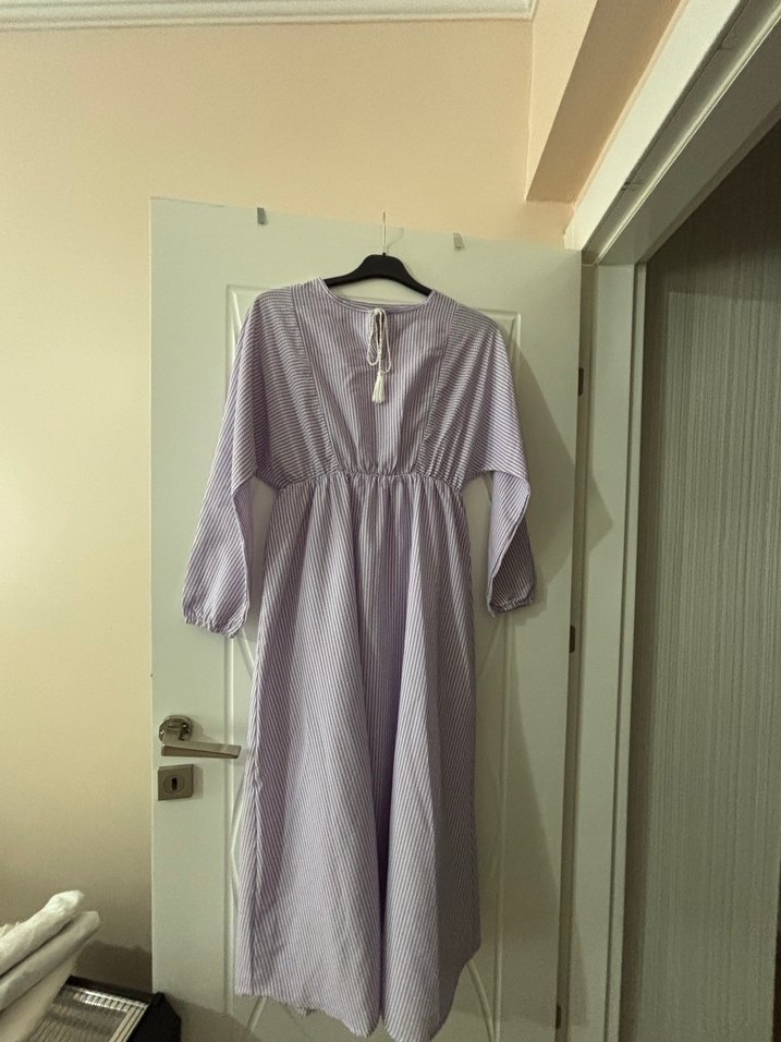 Yumuşak keten kumaştan, bol kesim ve V yakalı uzun elbise. Mor pastel renkte, pile detaylı ve minimal tarzda, günlük kullanıma uygun.