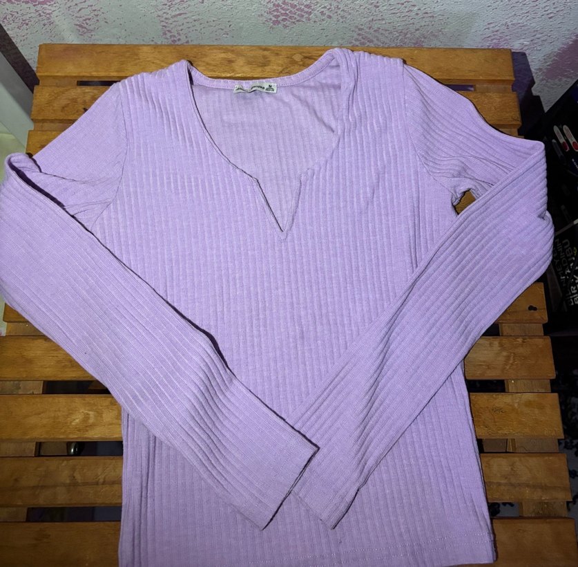 Pastel mor tonlarında, V yaka ve uzun kollu, ince triko örgü dokulu, günlük rahat sokak stili için uygun, vücuda oturan kazak.
