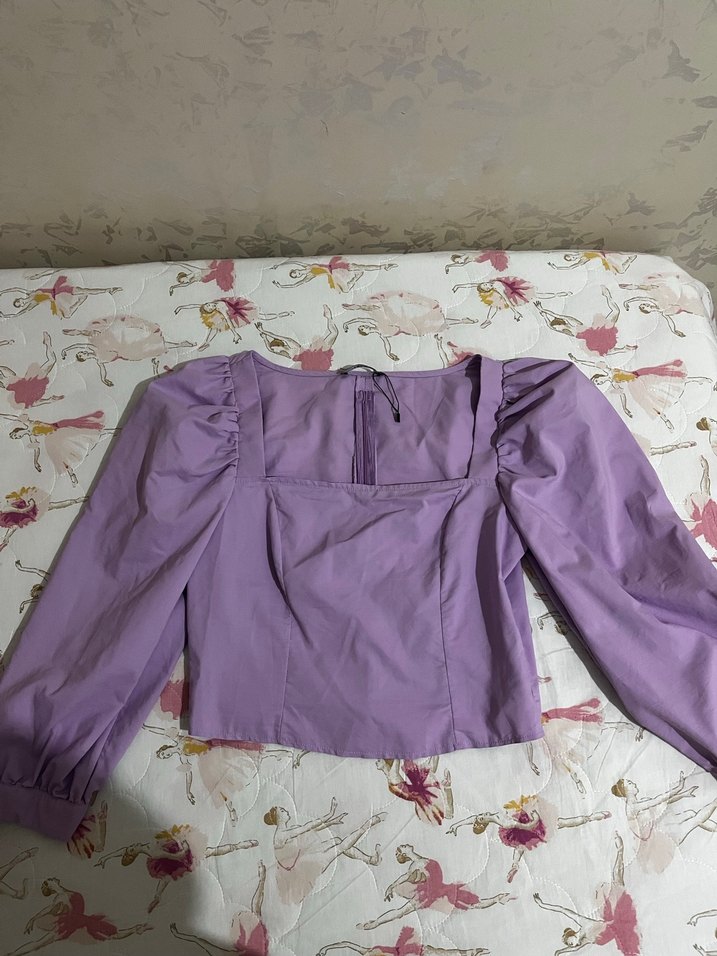 Mor, v yaka ve uzun kollu, oturan kesime sahip kadın bluz. Yumuşak sentetik kumaştan, drapeli tasarım ve midi uzunlukta, günlük rahat stil için uygun.