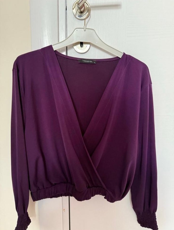 Kadınlar için mor renkte, V yakalı ve uzun kollu bluz. Salaş kesimli, drapeli ve ipeksi dokulu, günlük kullanıma uygun midi boyda ve minimalist tarzda.