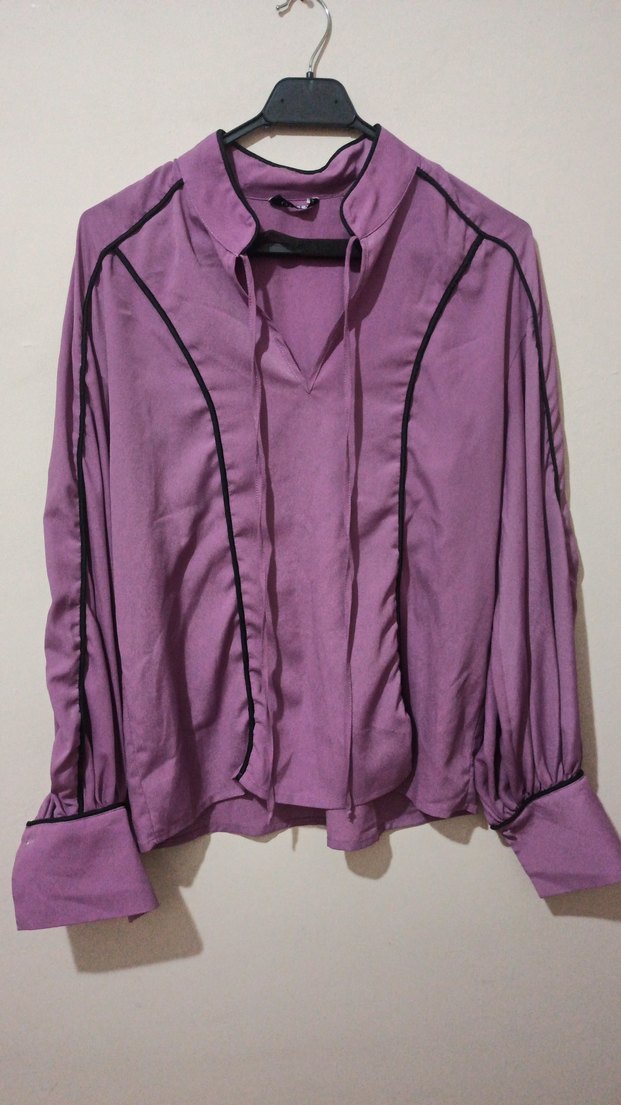 Mor, lila, eflatun, uzun kollu, hakim yakalı, kol.manset düğmeli ve bol kesim kadın gömleği. rahat kumaştan, parlak ve desensiz, siyah şerit detaylı, günlük yada ofis kullanımı için uygun.