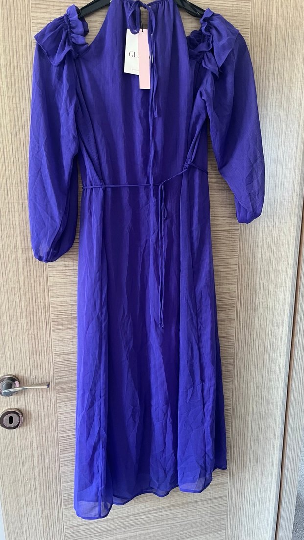 Mor renkli, pilili ve bol kesim uzun elbise. V yaka ve uzun kollu, yumuşak sentetik kumaştan. Bohem ve minimalist tarzlara uygun, romantik akşamlar için ideal.