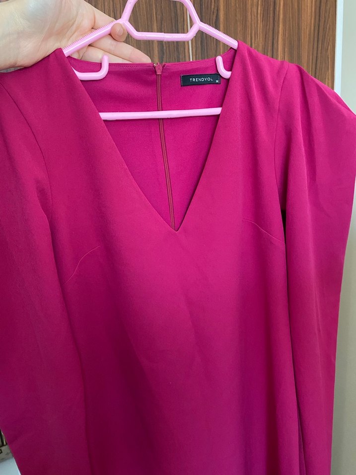 Mor renkte, V yakalı ve uzun kollu şık gece elbisesi fermuarlı midi boyda