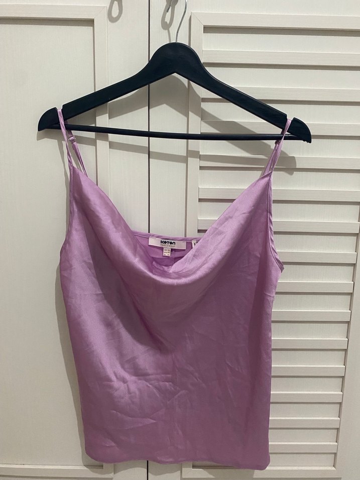 Mor pastel renkli, askılı, V yakalı ve dökümlü kadın bluz. İpek gibi kumaştan, midi boyda ve bol kesimdir. Minimalist tarzda, romantik akşamlar için uygundur.