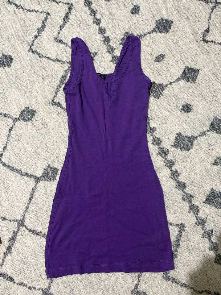 Mor renkli, V yakalı, dantelli kolsuz triko elbise. Sentetik kumaştan, bağlama desenli, midi boyda ve vücuda oturan kesime sahip. Penye pamuklu elbise 36 beden marka temsili