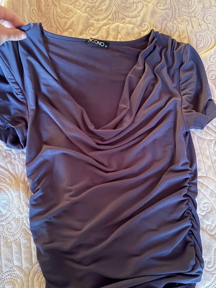 Mor renkte, v yakalı ve drapeli kısa kollu, ipeksi dokulu, vücuda oturan kadın bluzu. Romantik akşamlar için uygundur.