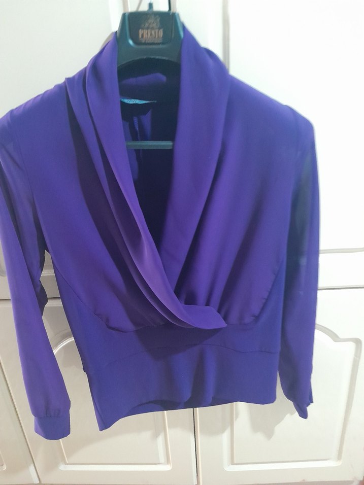 Kadınlar için dar kesim, mor renkte, ipeksi kumaştan, drapeli V yakalı uzun kollu ve midi boyda bluz. Ofis için modern tarzda uygundur.