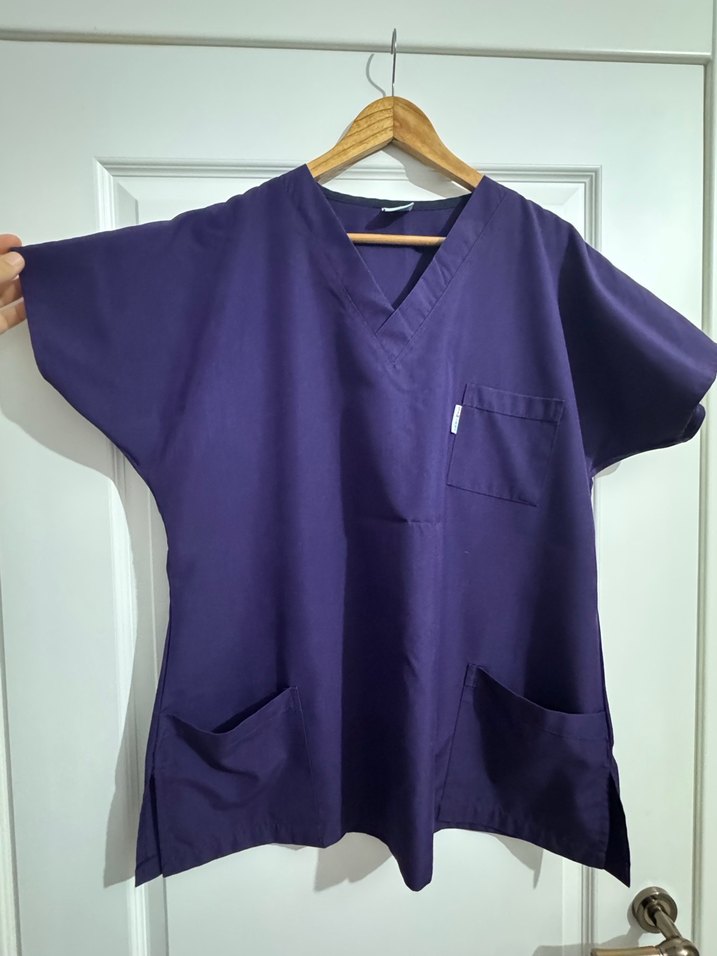 Koyu mor renkte, V yakalı, kısa kollu, bol kesim ve midi boy hemşire önlüğü. Üç cep içerir, desensiz tasarıma sahiptir.