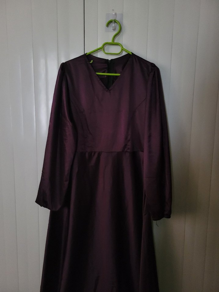Mor renkte, V yakalı ve uzun kollu, saten elbise kemeri mevcuttur ve arkasında fermuar mevcuttur sadece 1 kere mezuniyette giydim