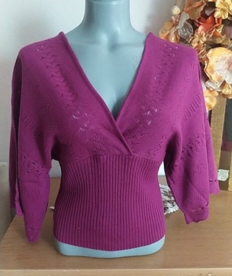 Mor renkli, V yakalı, uzun kollu, kısa ve bol kesim örgü kadın kazak. Rahat ve bohem tarz için uygun.