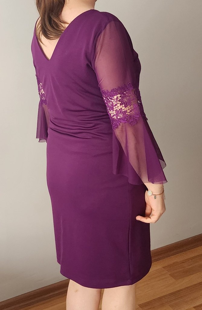 Mor renkli, V yakalı ve dantel detaylı tül kolları olan, klasik ve etkileyici midi abiye elbise.42 44 46 bedene uyumludur kol boyu 46 eni 50 boyu 99