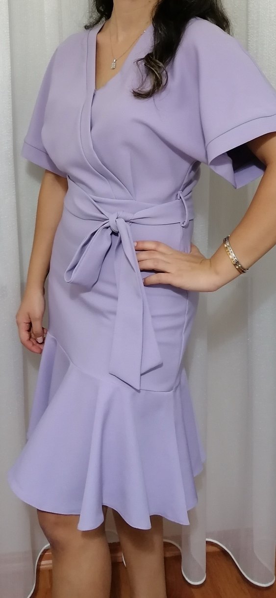 Mor pastel renkli midi elbise, V yakalı ve drapeli tasarıma sahiptir. Belde bağlamalı, askılı kollu ve regular fit kesimdir. İş ortamına uygundur.