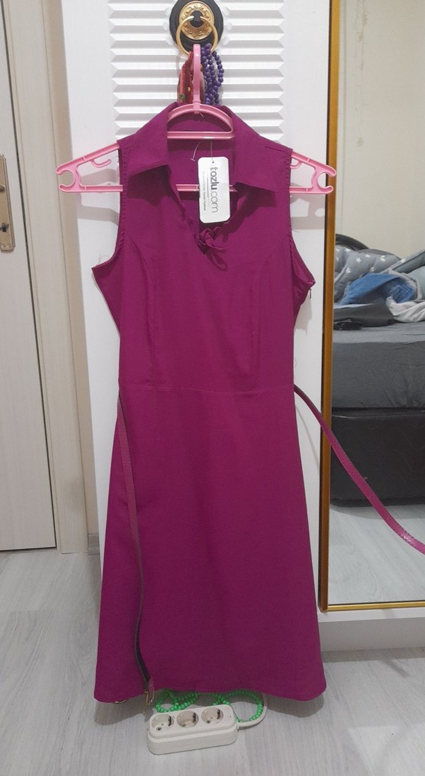 Mor renkte, V yakalı ve kolsuz midi boy elbise. Düzenli kesimi ve sade tasarımıyla günlük şıklık ve sokak modasına uygundur. Ürün hiç kullanılmadı