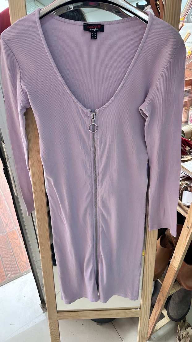 Pastel mor renkli, önü fermuarlı ve V yakalı, uzun kollu, midi boy triko elbise. Yumuşak sentetik kumaştan, şık ve rahat günlük sokak stili için uygun. Ölçüleri m beden olup iki kol arası 40 boyu 84cmdir Lütfen ölçülere göre alım yapınız iade kabul edilmemektedir.