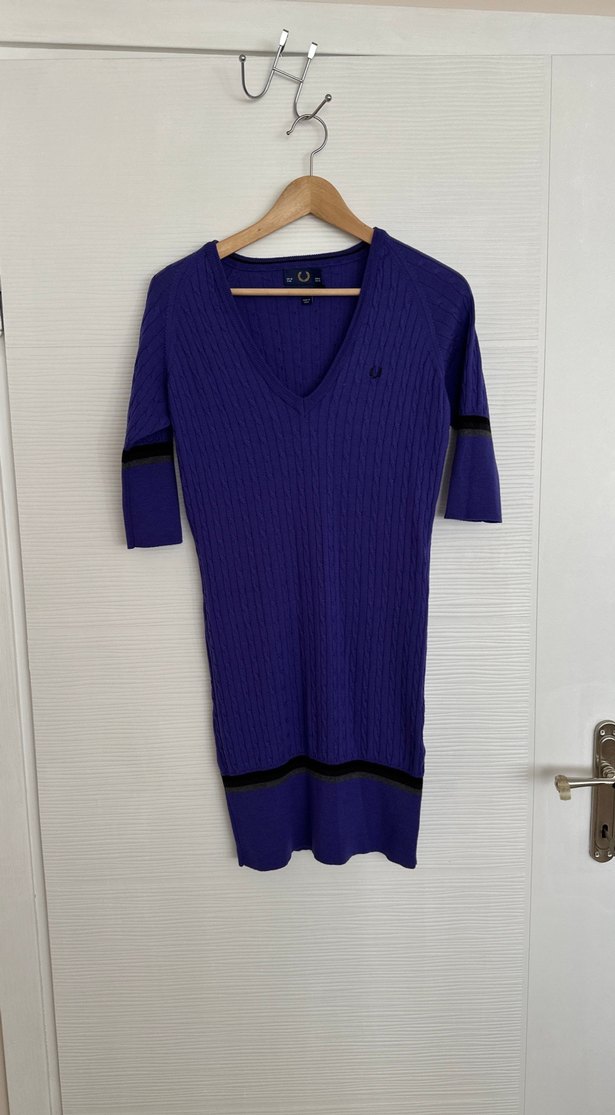 Mor, örgü kumaştan, V yakalı ve kısa kollu midi boy, vücuda oturan elbise. Kollar ve etekte siyah şerit detaylar bulunur. Günlük sokak stiline uygundur.