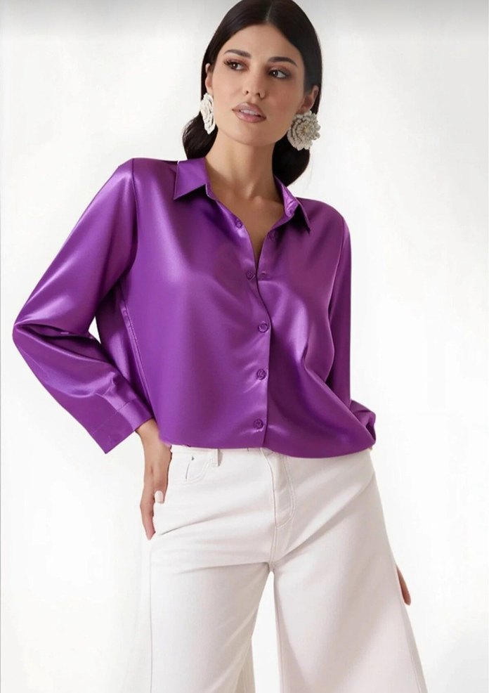 Mor parlak saten kumaştan, V yakalı ve düğmeli kadın gömleği. Uzun kollu, normal kesim ve midi boyda, desen içermeyen modern bir tasarımdır. hiç kullanmadım etiketi mevcut değil fakat yeni ürün